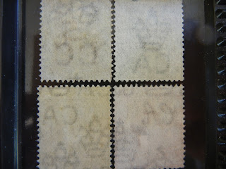 Remember I mentioned that all the definitives up to 1962- save for a few during WWII- were De La Rue printings? Well here is the exception. The left stamp is a perf 14, De La Rue. But the right stamp was printed by Harrison & Sons (and Bradbury, Wilkinson & Co Ltd, printed some others), is perf 14 1/2 X 14, and has a more coarse impression. The coarse impressions were printed for the 2c,4c,5c,10c,30c, and 50c denominations. I found this rough print 4c orange in my collection by checking perfs and impression printings for these denominations. You might harbor some of these too. ;-)