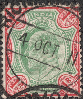 The Edward VII Monarch era began in 1902, with the issue of 17 stamps. I chose the nice bi-colored 1r carmine rose & green for illustration purposes here. CV is <$1-$2+ for 9 stamps.