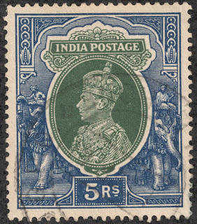 The higher values for the set were in a larger format, with a regal portraiture of "George VI". I love the elephants on each side of the portrait vignette.
