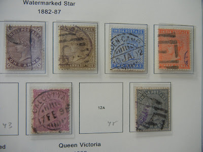 *45: Note- BB probably intended this to be 45, as this is under the 1882-87 issues spaces. But BB illustrates 1876 Scott 34 12a "East India postage" cut. I am keeping Scott 45 for the checklist, but if the collector wishes to put in Scott 34, that could be a choice..