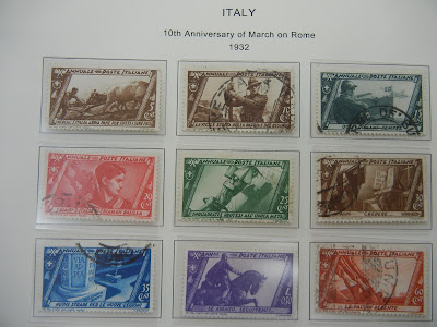 In 1932, a large 16 stamp set was issued celebrating the "March on Rome", and commemorating the 10th anniversary of the Fascist government.