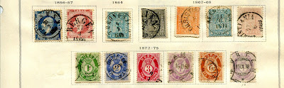 The first stamp of Norway in 1855 had the "Lion Coat of Arms", but the 1856-57 issue had the visage of King Oscar I. He was both King of Sweden and King of Norway from 1844- 1859. This was followed by Charles IV (1859-72), and Oscar II (1872-1905). Oscar II can be found on the stamps of 1877-78. But, for the most part, Norway used the "Post Horn" motif.